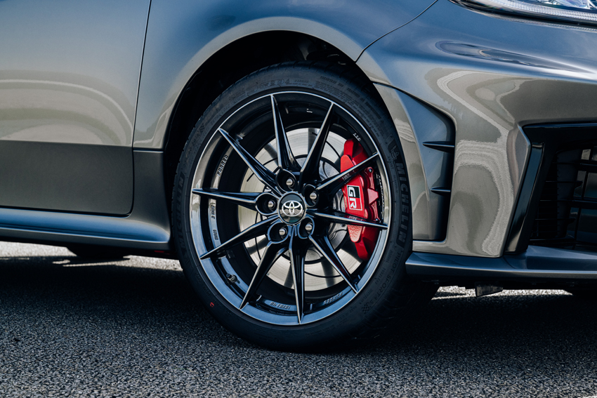 La GR Yaris hérite d'un système de freinage puissant et résistant composé de disques avant ventilés de 356 mm avec des étriers à 4 pistons en aluminium léger et des disques arrière ventilés de 297 mm avec des étriers à 2 pistons en aluminium. Les étriers sont peints en rouge et marqué avec le logo "GR". Elle sera équipée de jantes en alliage multi-branches de 18 pouces chaussées de pneus hautes performances Michelin Pilot Sport 4S. Des jantes en alliage BBS de 18 pouces seront disponibles en option.