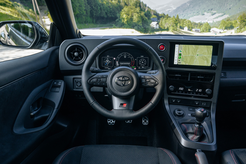 Inspiré des retours des pilotes de rallye, l'intérieur a été repensé. Les commandes ont été rapprochées du conducteur afin d'être plus facilement atteintes. Du côté passager, le plateau du tableau de bord a été agrandi afin de laisser la place pour accueillir des compteurs supplémentaires ou pour y installer un moniteur destiné au copilote. Le bord supérieur du tableau de bord a été abaissé de 50 mm permettant ainsi que de modifier la position du rétroviseur et d'incliner le panneau de commandes de 15 degrés supplémentaires vers le conducteur, modifications augmentant le champ de vision du conducteur. Il reçoit un nouveau combiné d'instruments numériques de 12.3 pouces complété par le système multimédia Toyota Smart Connect+, une navigation intégrée et gérée dans le could ainsi que la compatibilité avec les systèmes de Smartphone Apple CarPlay et Android Auto, le tout gérable par un écran tactile de 8 pouces. Les accessoires de série comprennent la climatisation automatique bizone, les sièges avant sports, des pédales en aluminium, un volant exclusif GT, des rétroviseurs extérieurs chauffants et rabattable électriquement, des vitres arrière surteintées et des phares automatiques. La clé numérique est intégrée dans une application et permet jusqu'à 5 utilisateurs d'accéder à la voiture et de la démarrer avec leur téléphone portable.