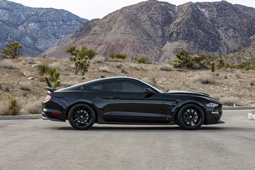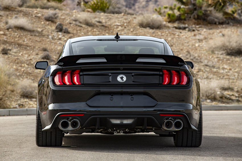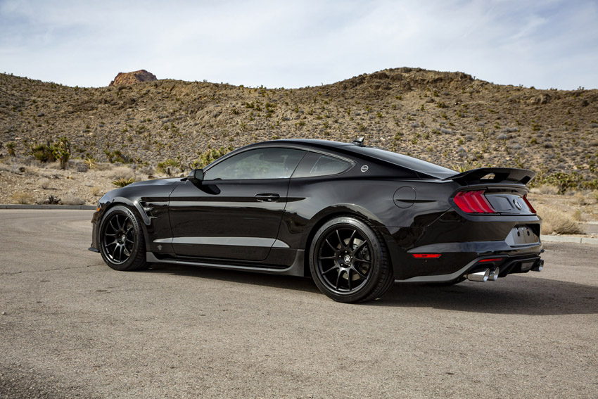 L’avant reçoit une calandre spéciale « Shelby » ainsi qu’une jupe avant. Le capot bénéficie de prises d’air afin d’alimenter en air le moteur suralimenté. Les ailes sont élargies afin de pouvoir y installer des jantes Shelby noir satiné de 20x11 pouces montées de pneumatiques sport de 305/30/20. La stabilisation de la voiture est assurée par un aileron arrière. De nombreuses bandes autocollantes disposées sur la voiture rappelleront l’événement en faisant hommage au fondateur. Et pour la première fois, des emblèmes et des insignes à l’image du chapeau Stetson noir qu’adorait porter Carroll Shelby feront leur apparition uniquement sur ce modèle.